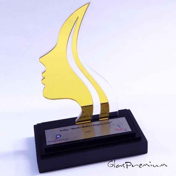 Troféu em acrílico cristal, dourado e prata sobre base de acrílico preta com madeira e placa de inox.