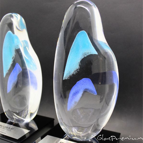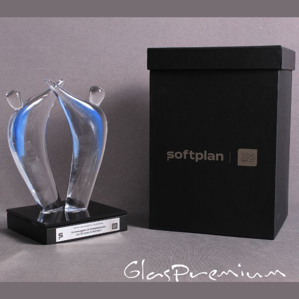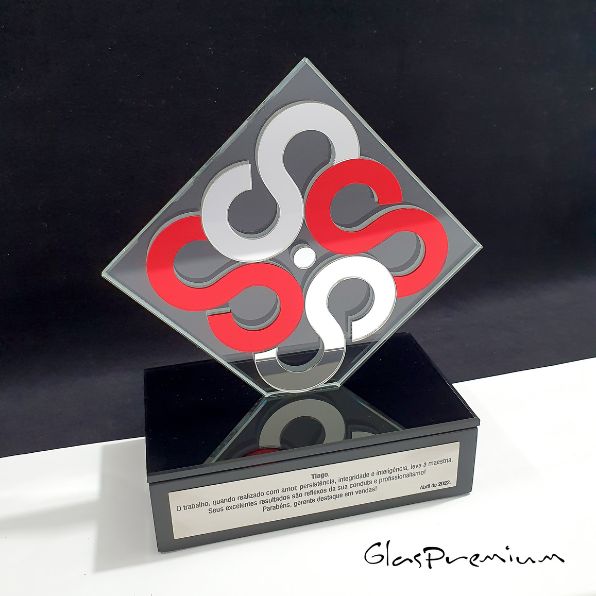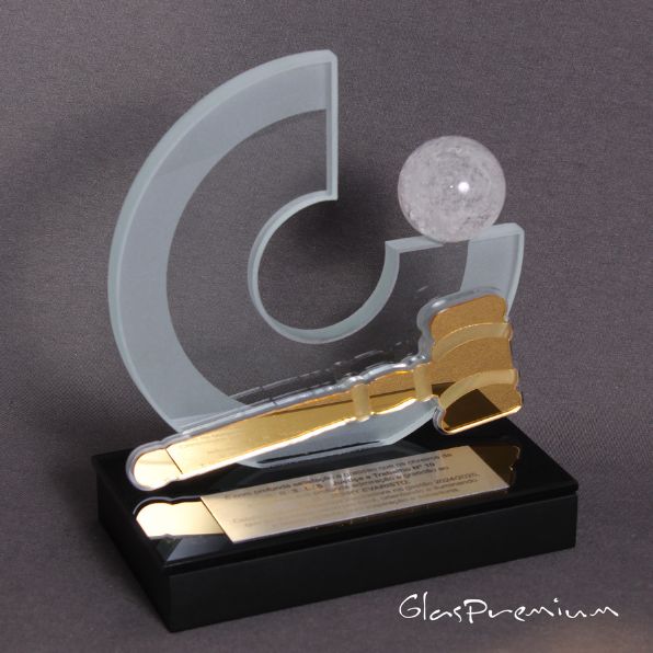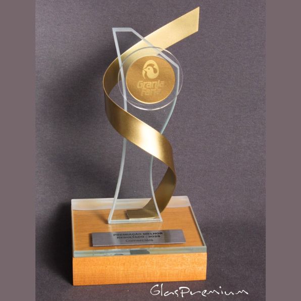 Troféu em vidro recortado com metal modelado e base de vidro com madeira.
