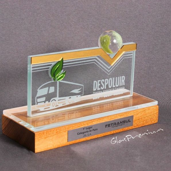 O Troféu Prêmio Gaúcho Despoluir é um símbolo de excelência ambiental no setor de transportes do Rio Grande do Sul, reconhecendo as transportadoras que mais se destacam em práticas sustentáveis e responsabilidade ecológica. O prêmio não é apenas uma peça simbólica: ele representa o esforço coletivo do setor em reduzir emissões, aumentar a eficiência energética e adotar práticas sustentáveis. O troféu foi feito de vidro com detalhes em acrílico colorido, bola de cristal e base de madeira com placa de inox com gravação à laser.
