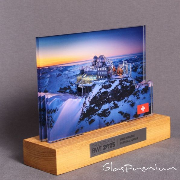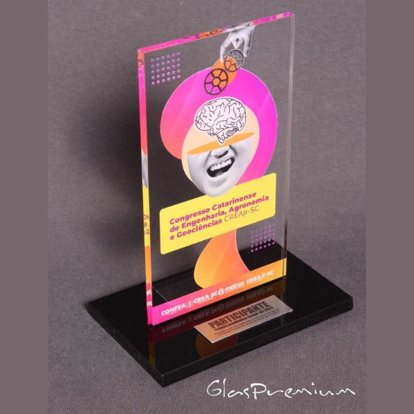 Placa de vidro com detalhes em acrílico e base de vidro com madeira.