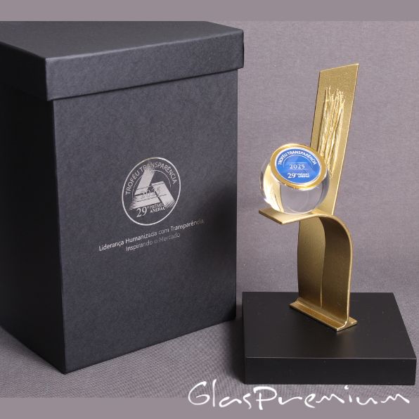 Troféu em vidro com bola de cristal, e detalhe em acrílico dourado sobre base de madeira preta.