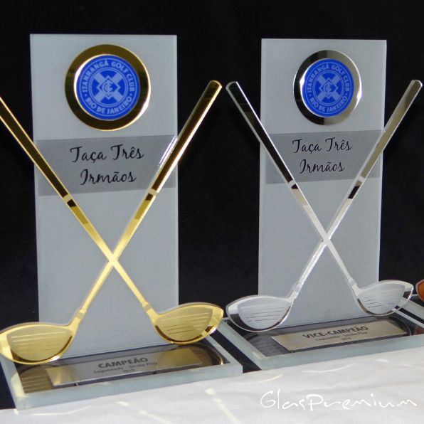 Troféu em vidro com detalhes em acrílico espelhado.