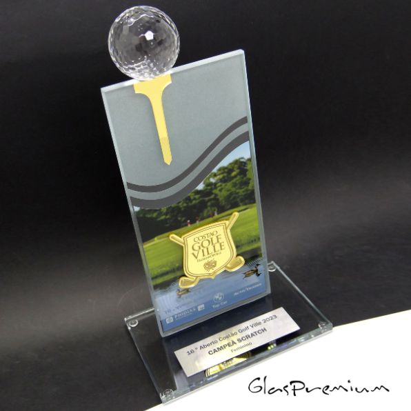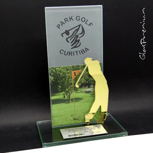 Placa de vidro com gravação em UV, bola de cristal e detalhe em acrílico espelhado.