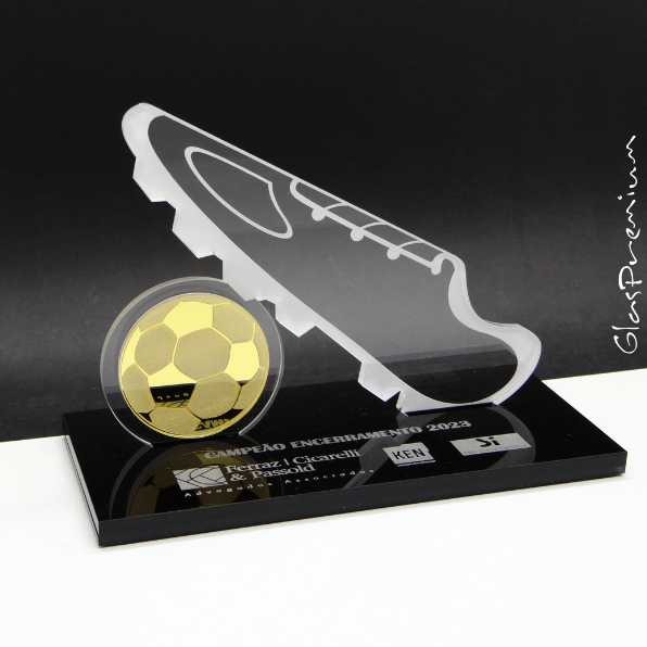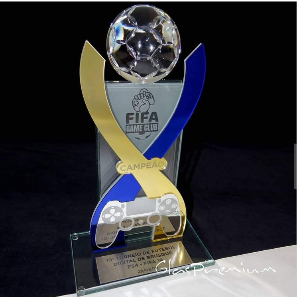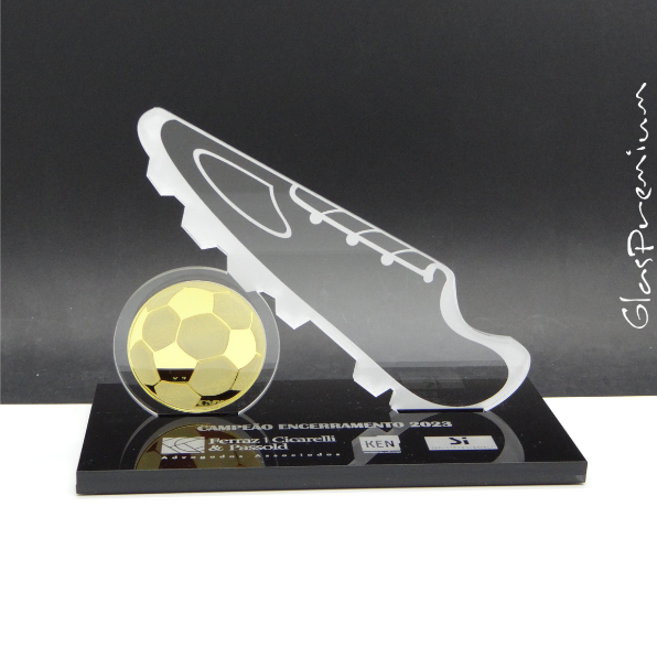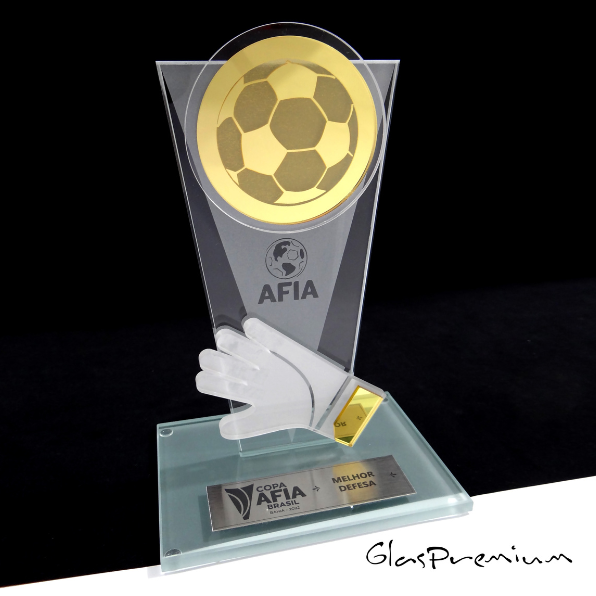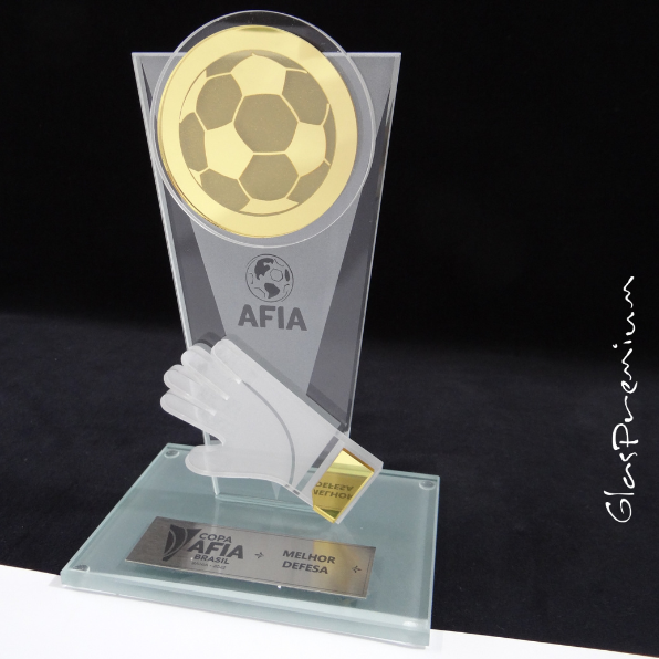 Troféu em vidro com detalhes em acrílico dourado e bola de cristal.
