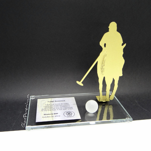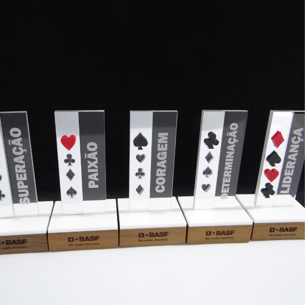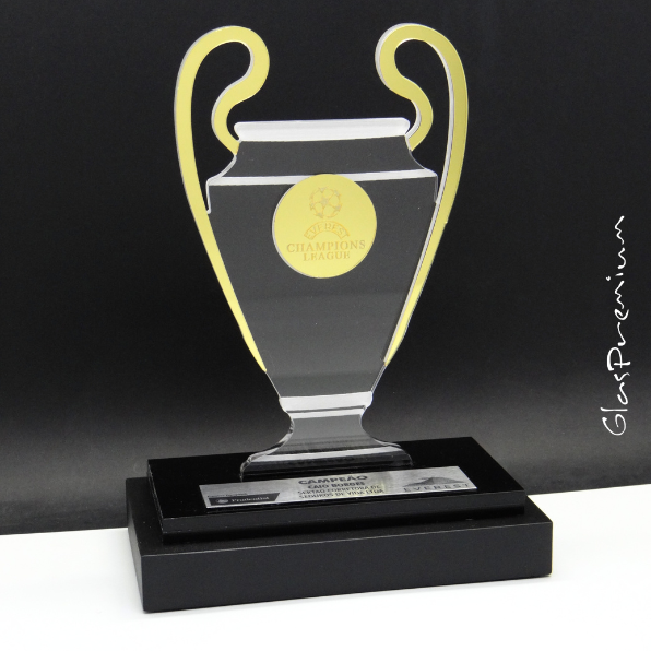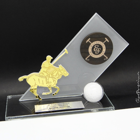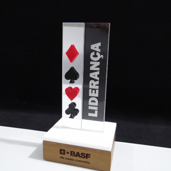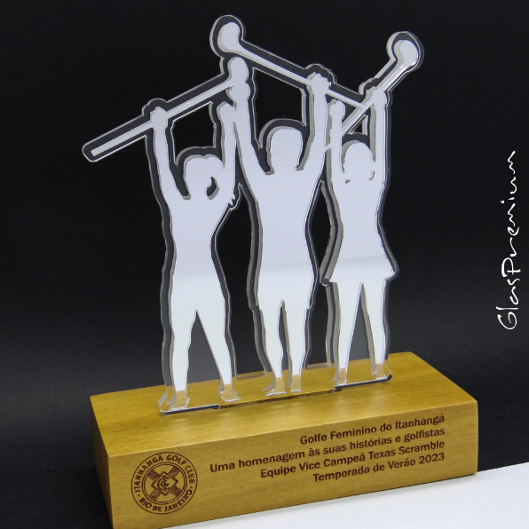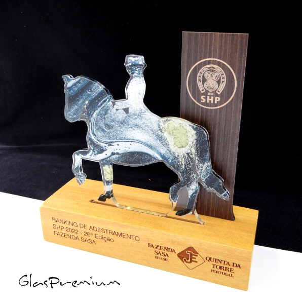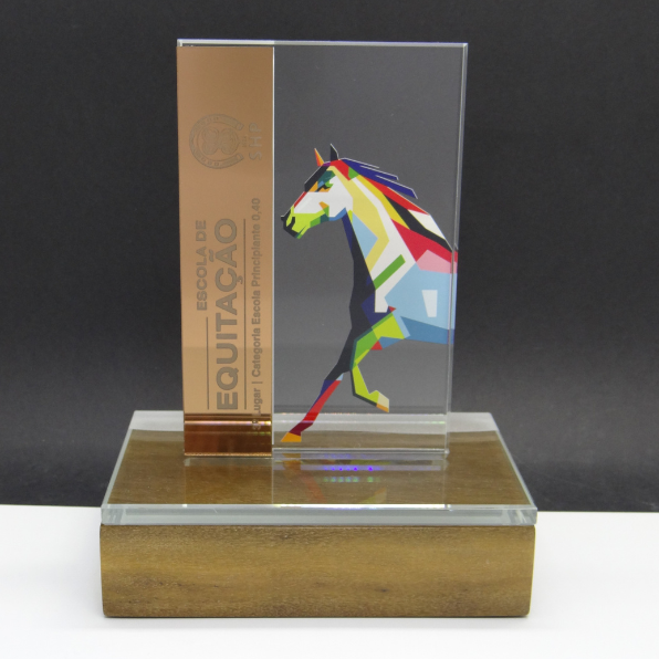 Troféu em vidro e acrílico com gravação UV, sobre base de madeira.