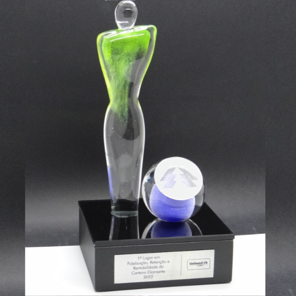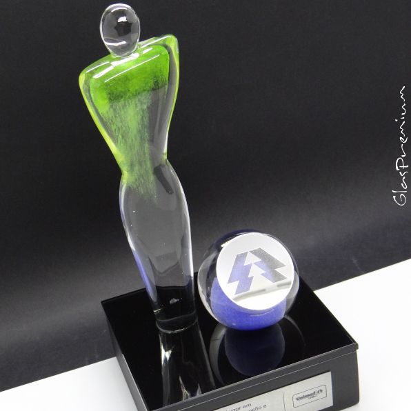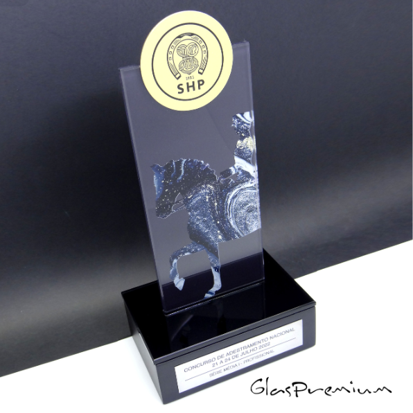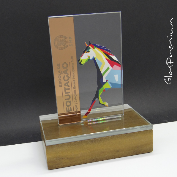 Troféu em vidro com gravação colorida UV, selo em metal e base de madeira alta.