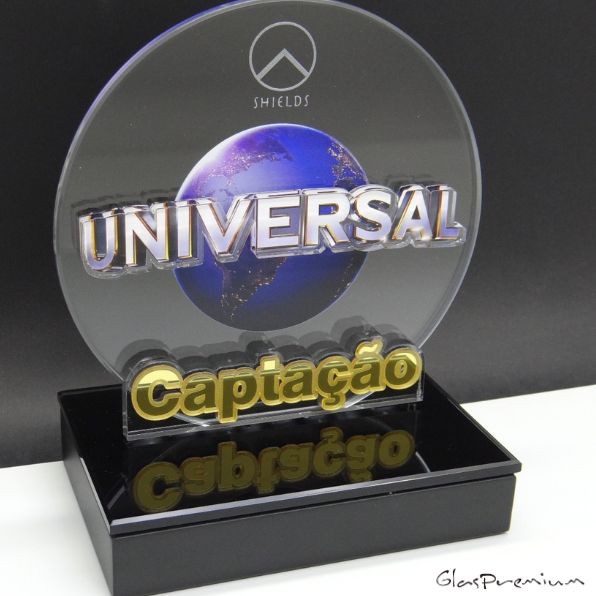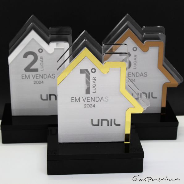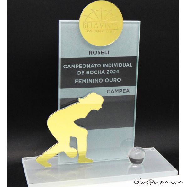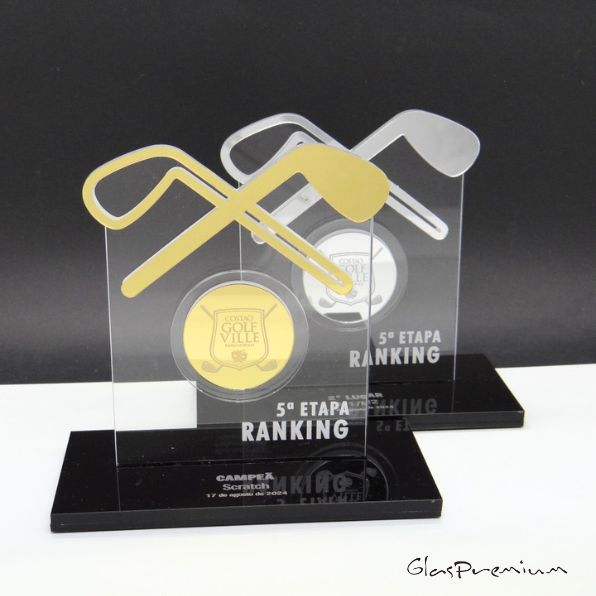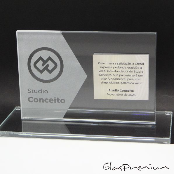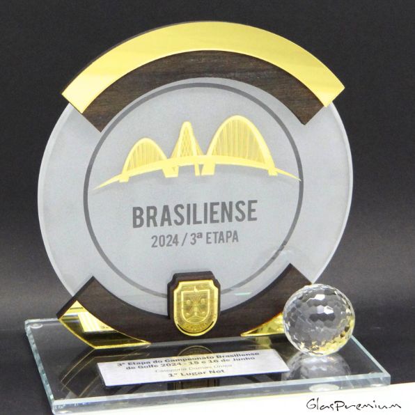 Troféu em placa de vidro com detalhes em acrílico espelhado dourado.