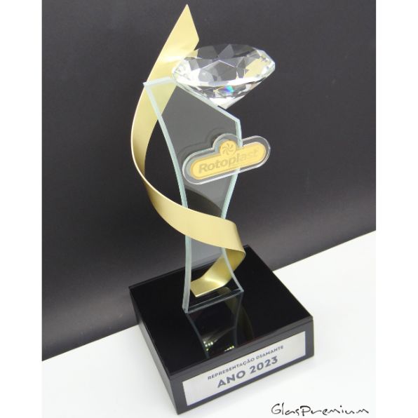 Troféu em vidro recortado, metal trançado com cristal e base de madeira e vidro.