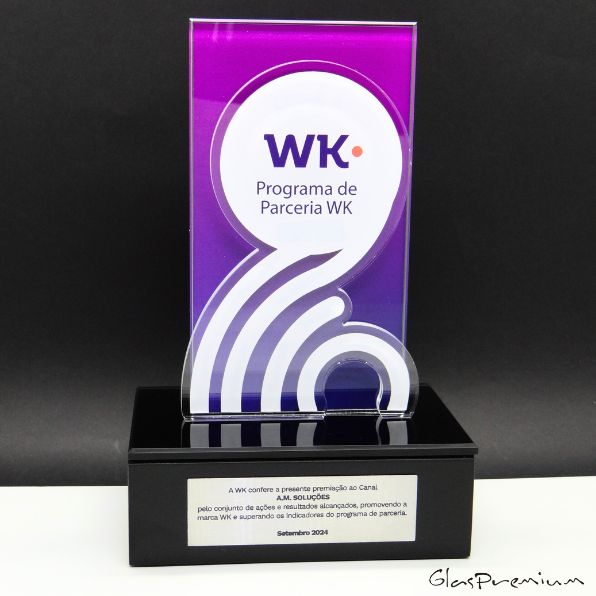 Troféu de acrílico em camadas sobre base de madeira e acrílico.